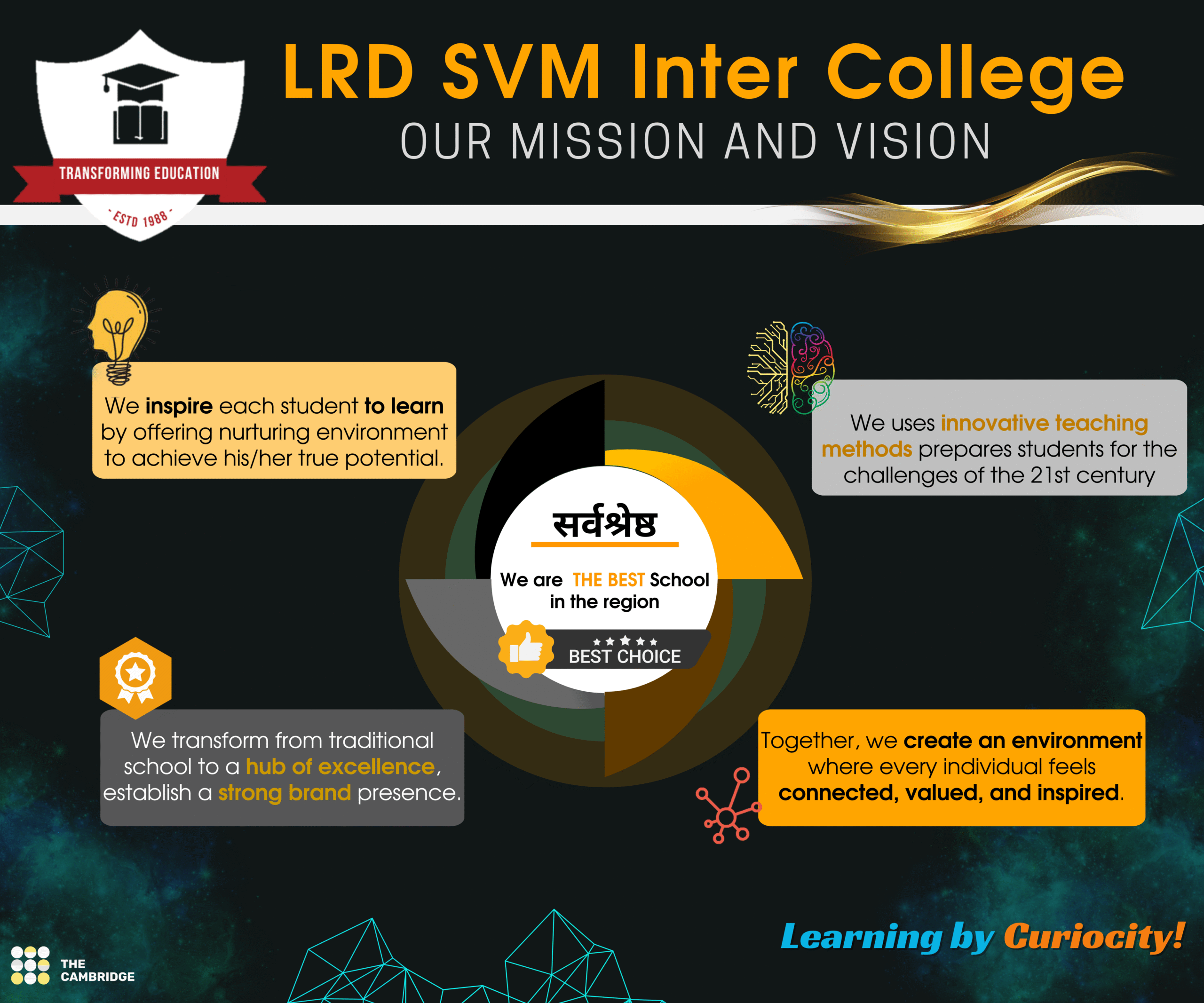 Established in 1988, LRD SVM Inter College is a leading English-medium institution dedicated to shaping confident, disciplined, and future-ready students. Situated amidst 9000 sq. meters of lush greenery, our campus blends traditional Indian values with modern global education. With a team of experienced educators, advanced learning facilities, and a skill-oriented curriculum aligned with NEP guidelines, we ensure every child grows academically, emotionally, and socially. Our mission is simple—to prepare students for life, not just exams, through world-class education rooted in culture, innovation, and character-building.